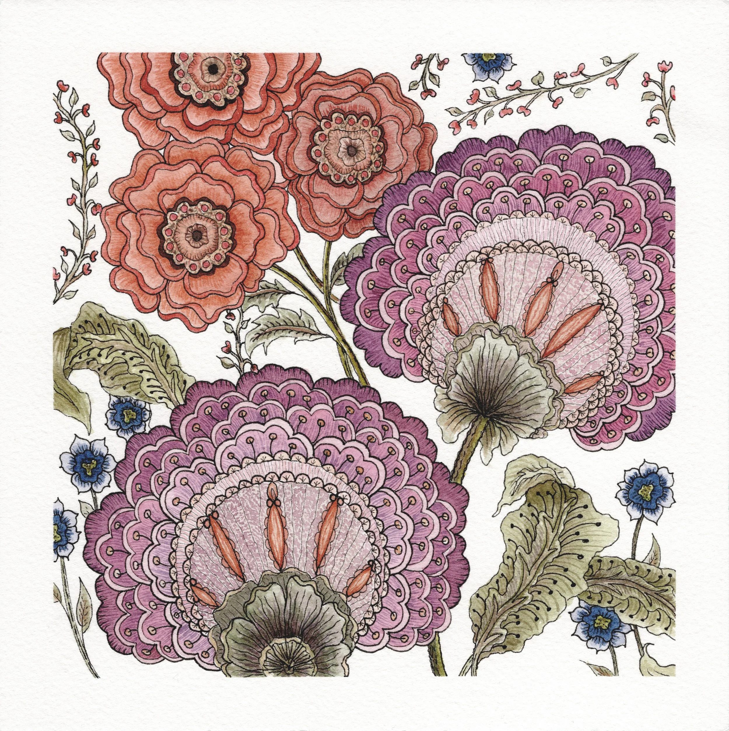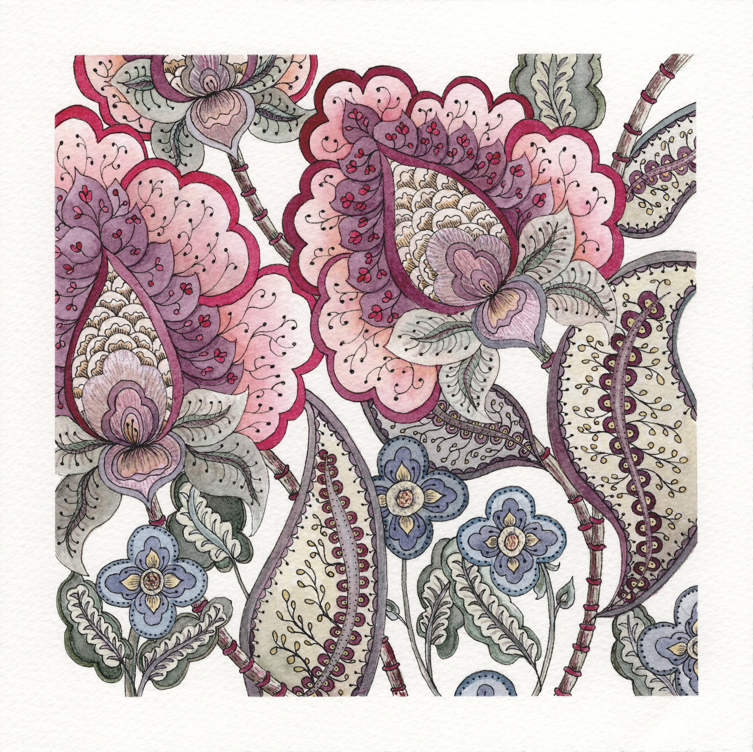 This series is a deep dive into exploring historical tapestries, patterns, and botanical prints and evolving them into a design language that is from my world and the way I draw. These floral paintings are fantastical and have been fun to paint.